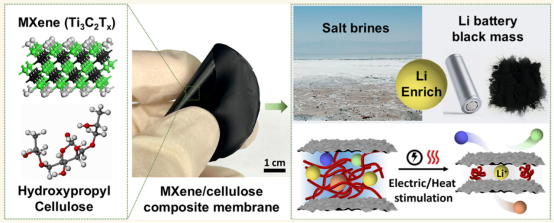 锂作为锂离子电池的核心材料,在可再生能源系统和电动交通迅猛发展的背景下,其全球需求持续攀升。该工作成果研制出一种基于Ti₃C₂Tₓ MXene与羟丙基纤维素(HPC)的纳米受限温敏复合膜,可用于锂离子(Li⁺)的高选择性提取。该复合膜融合了MXene优异的电热传导性能与HPC的水合响应门控特性,构建出具有可调控间距的异质通道结构,借助纳米限域效应实现了基于离子水合半径和相互作用能差异的精准筛分与传输调控。