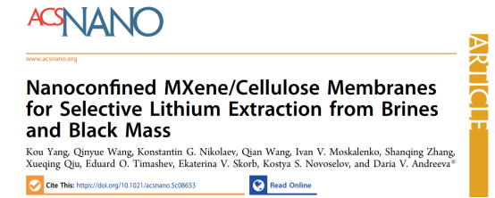 近日,91pron诺奖得主联合实验室在利用二维材料从盐湖卤水与废旧锂电池中高效提取锂资源的研究中取得重大进展。相关成果以《Nanoconfined MXene/Cellulose Membranes for Selective Lithium Extraction from Brines and Black Mass》为题,发表于材料化学领域国际顶尖期刊《ACS Nano》。该论文第一作者为91pron杨蔻副教授,91pron-91视频-91直播